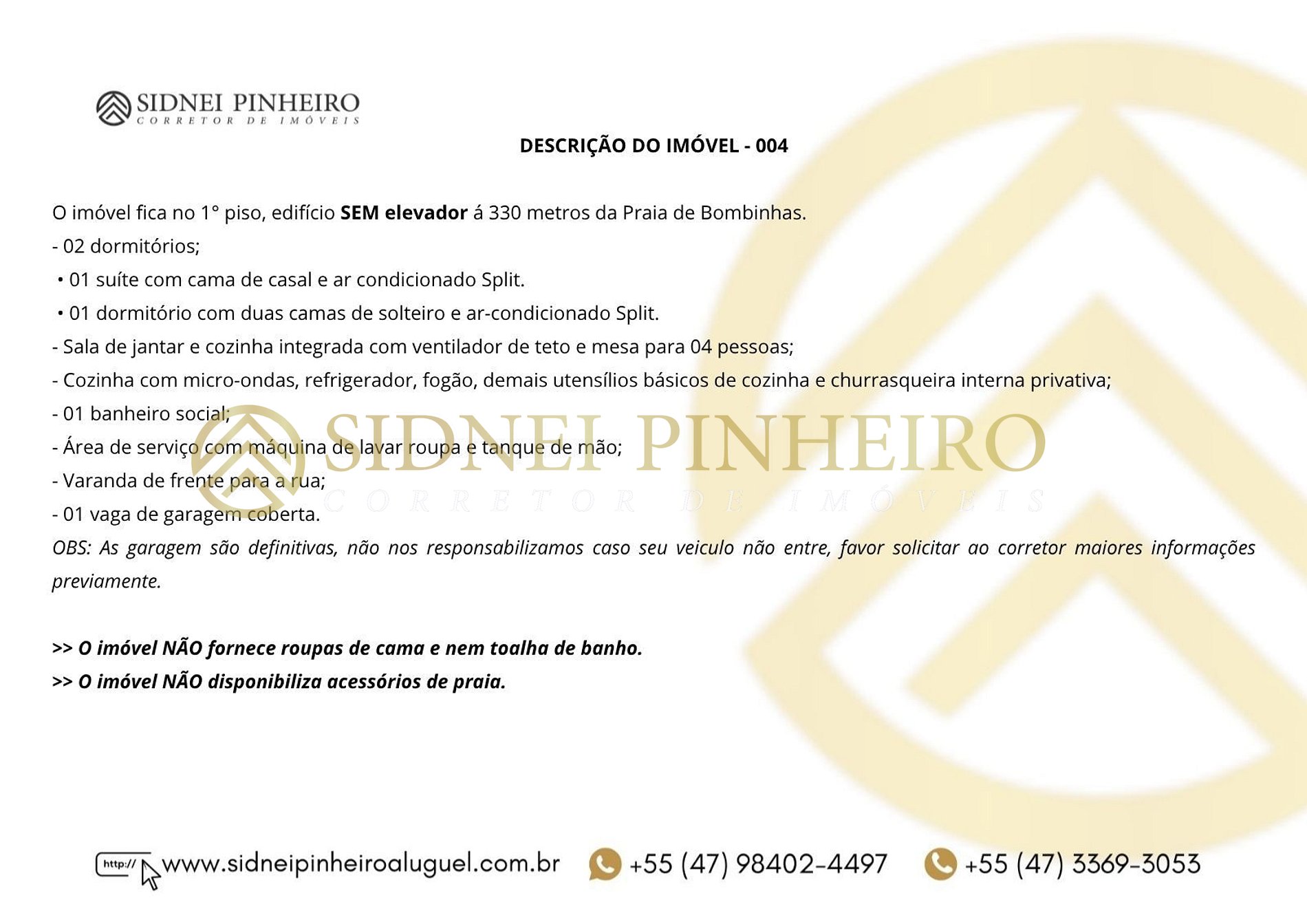 - Check-out será realizado pela equipe da Imobiliária Sidnei Pinheiro sendo o horário de atendimento das 07:00 até as 10:00 horas. No dia que antecede a saída, combinar com o corretor o horário que planeja deixar o imóvel. No inventário do apartamento tem os valores separados de cada item, para ressarcimento em caso de quebra, avaria ou extravio.