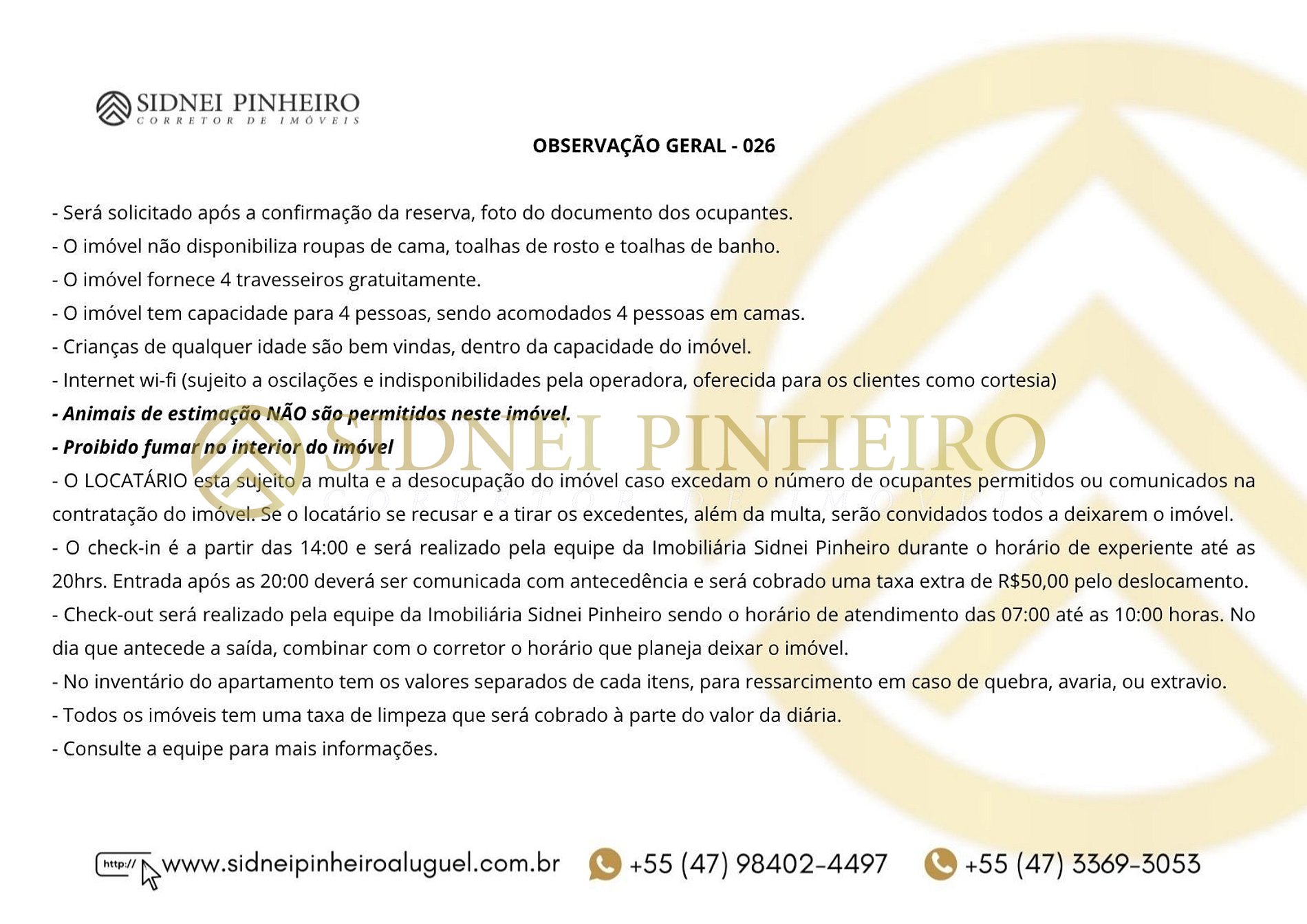 - Check-out será realizado pela equipe da Imobiliária Sidnei Pinheiro sendo o horário de atendimento das 07:00 até as 10:00 horas. No dia que antecede a saída, combinar com o corretor o horário que planeja deixar o imóvel. No inventário do apartamento tem os valores separados de cada item, para ressarcimento em caso de quebra, avaria ou extravio. Consulte a equipe para mais informações.