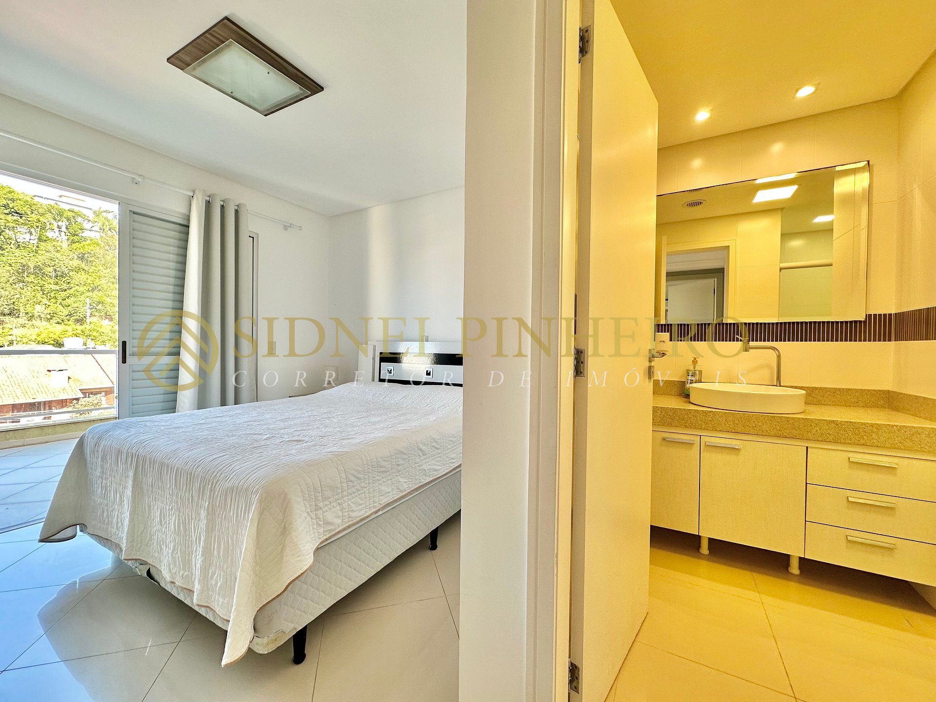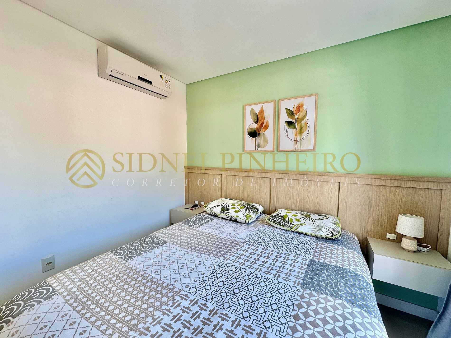 • 1 suíte com cama de casal, ar condicionado Split e saída para a sacada com vista para o mar;