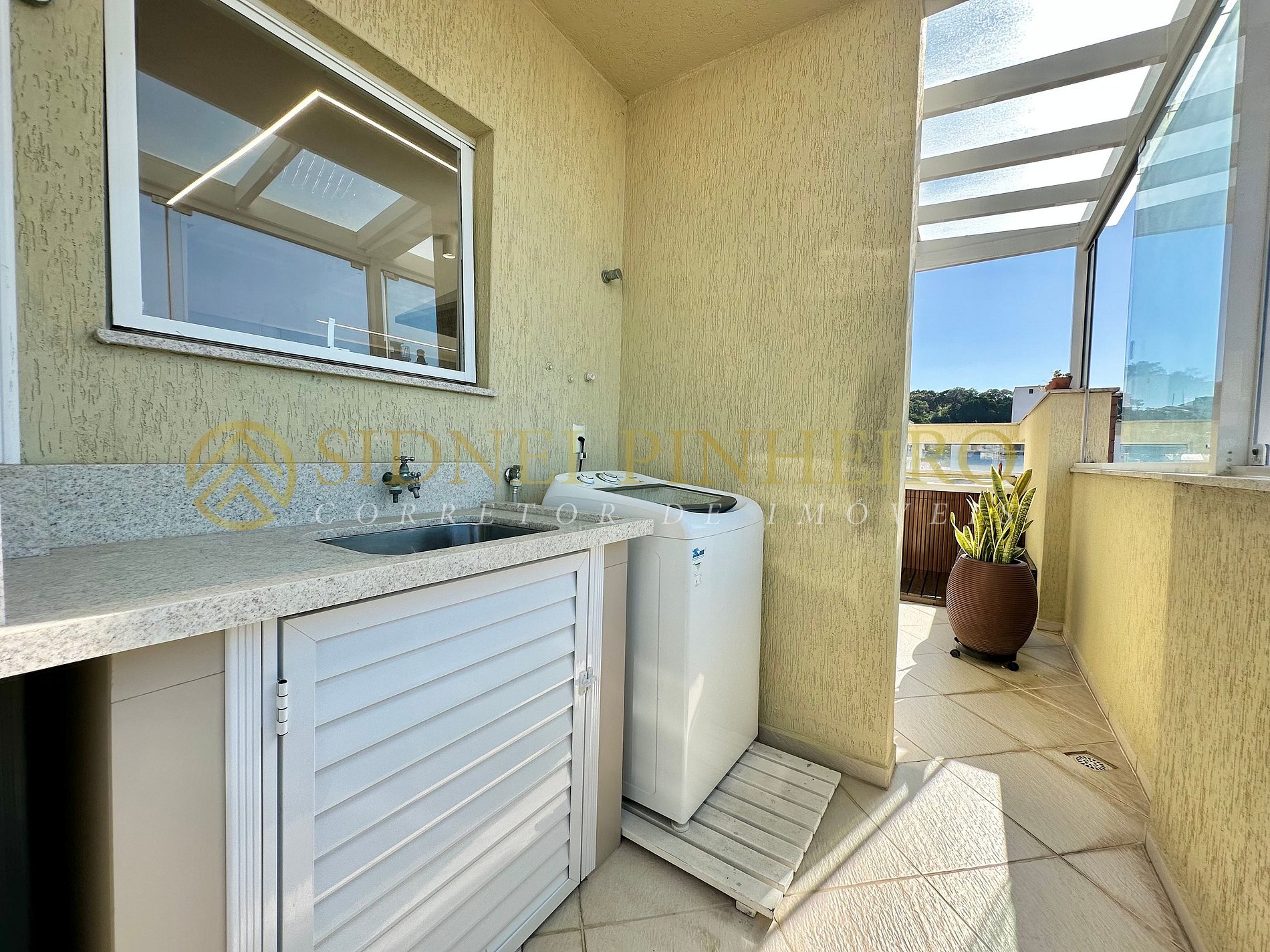 - Área de serviço com máquina de lavar roupa e tanque de mão;