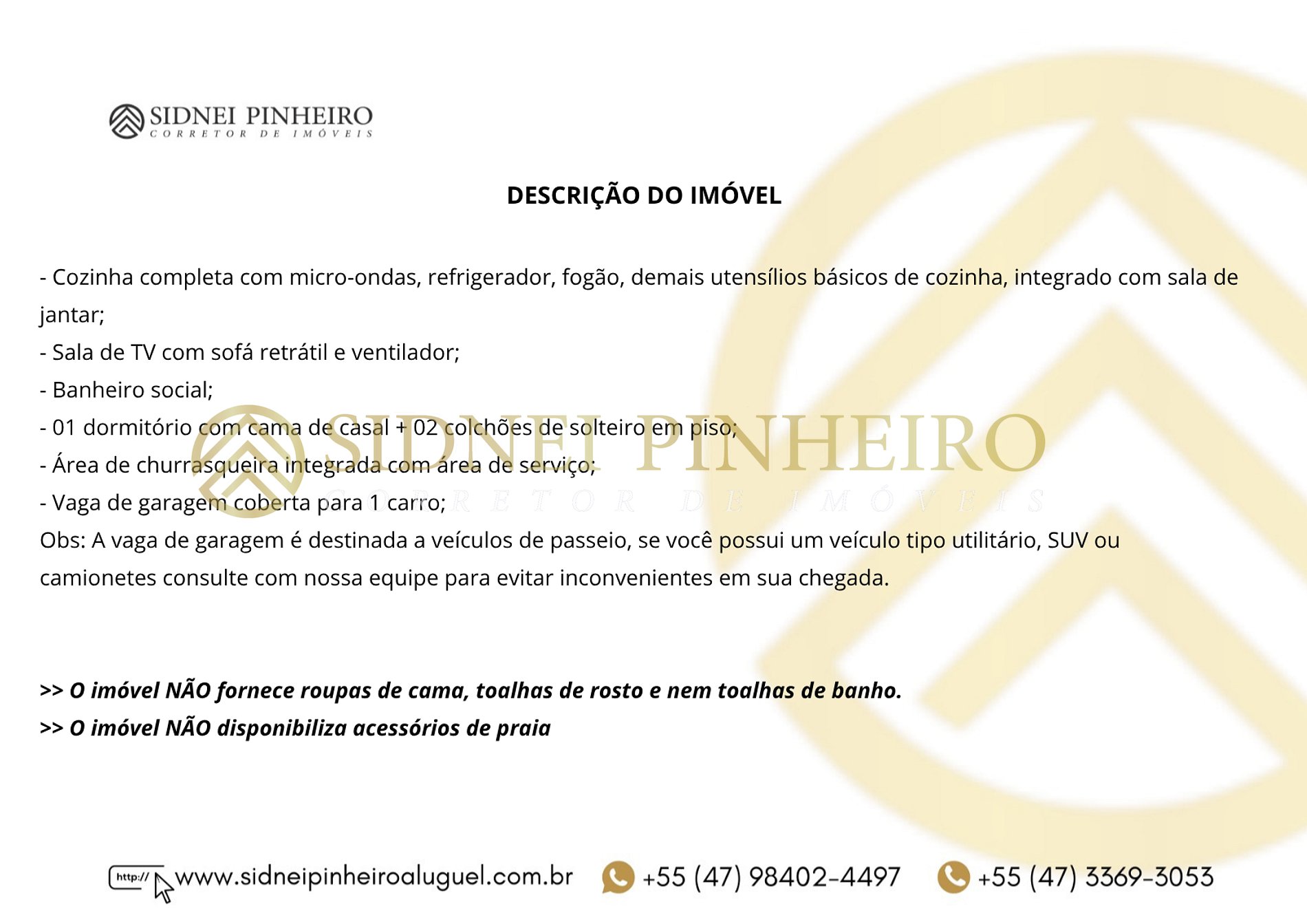 - Check-out será realizado pela equipe da Imobiliária Sidnei Pinheiro sendo o horário de atendimento das 07:00 até as 10:00 horas. No dia que antecede a saída, combinar com o corretor o horário que planeja deixar o imóvel. No inventário do imóvel tem os valores separados de cada item, para ressarcimento em caso de quebra, avaria ou extravio.