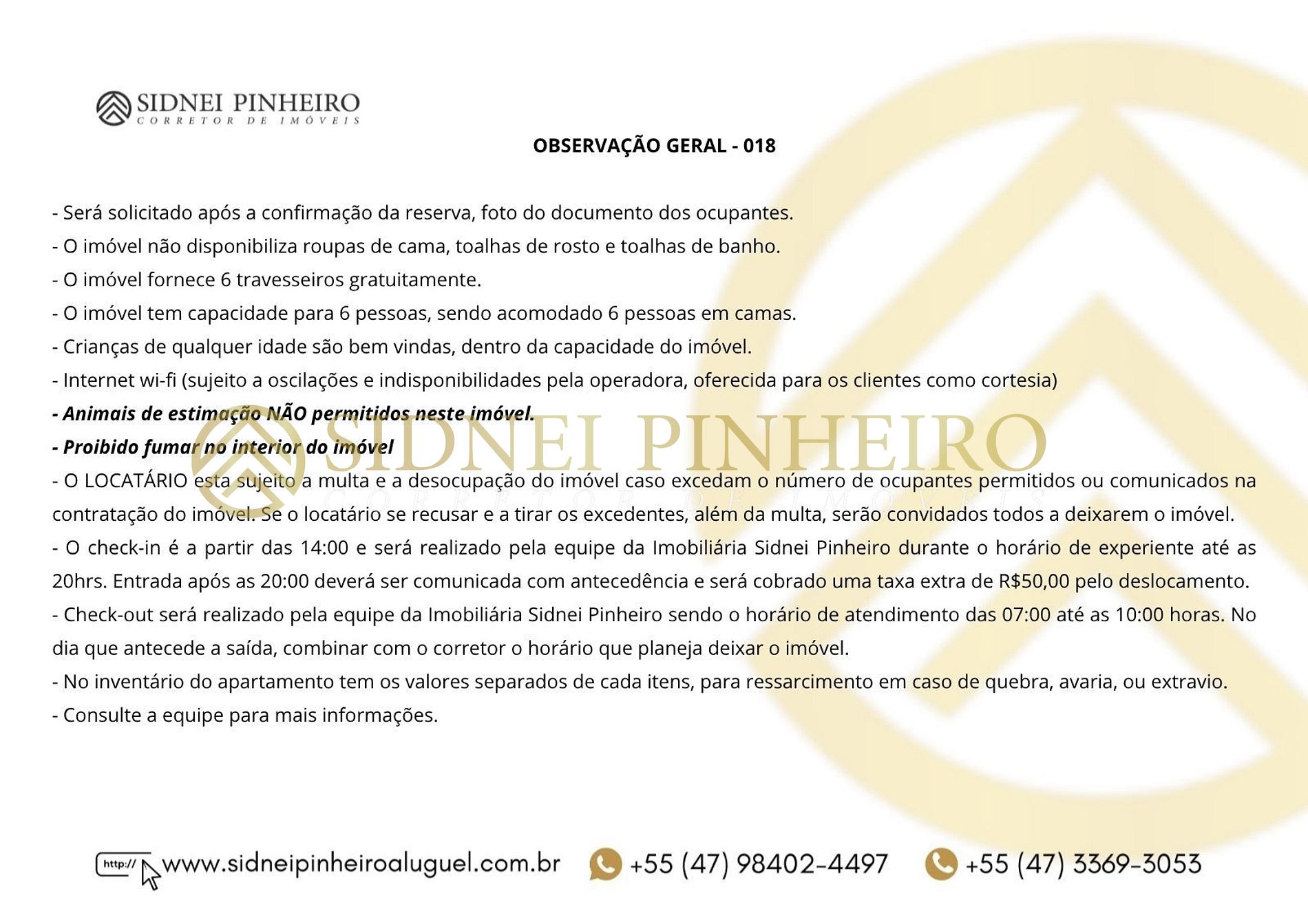 - O check-in será realizado pela equipe da Imobiliária Sidnei Pinheiro sendo o horário de atendimento das 14hr até as 20hrs. OBS: Entrada após as 20:00 deverá ser comunicada com antecedência e será cobrado uma taxa extra de R$50,00 pelo deslocamento.