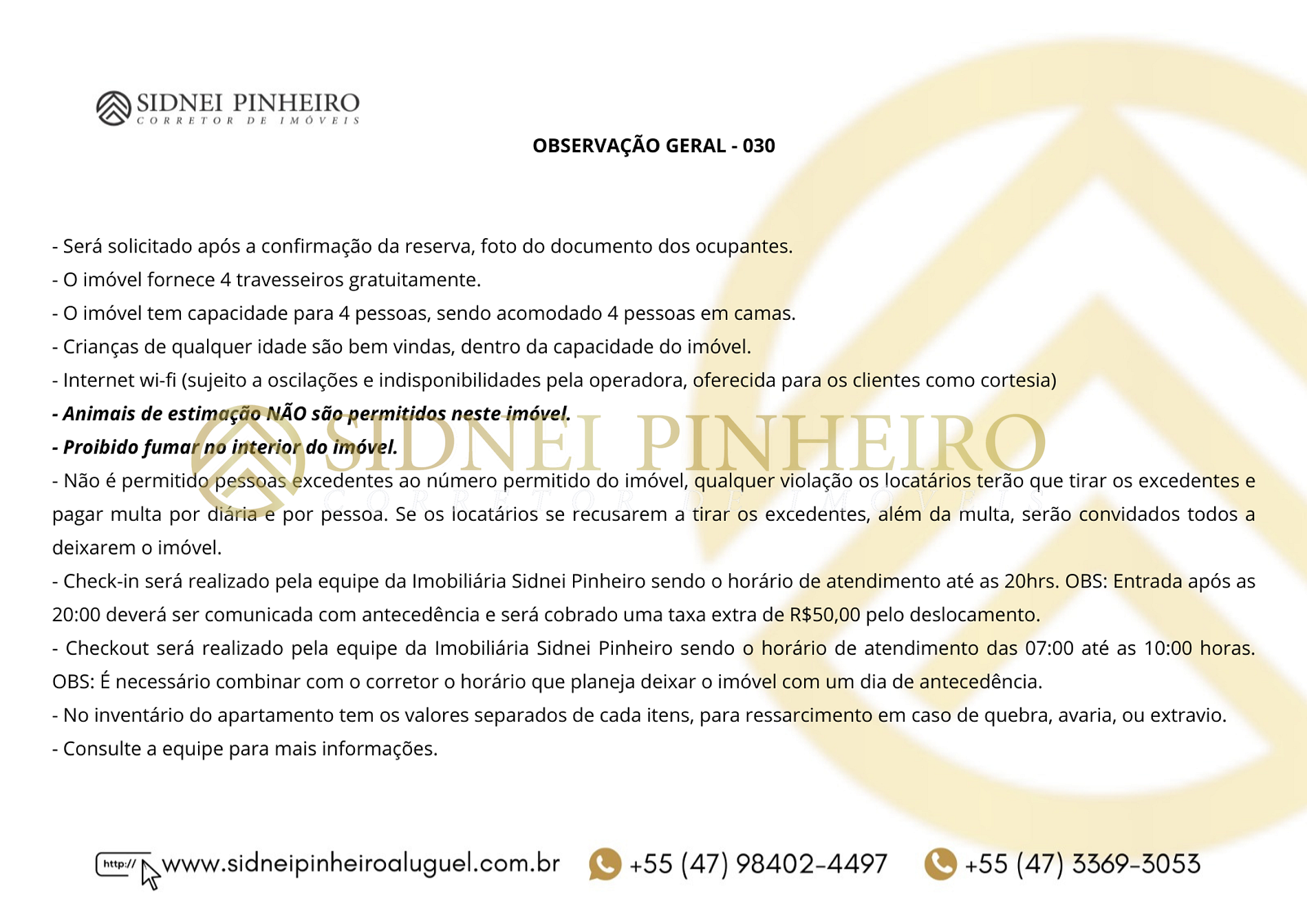 - Check-out será realizado pela equipe da Imobiliária Sidnei Pinheiro sendo o horário de atendimento das 08:30 até as 10:00 horas. No dia que antecede a saída, combinar com o corretor o horário que planeja deixar o imóvel. No inventário do apartamento tem os valores separados de cada item, para ressarcimento em caso de quebra, avaria ou extravio. Consulte a equipe para mais informações.