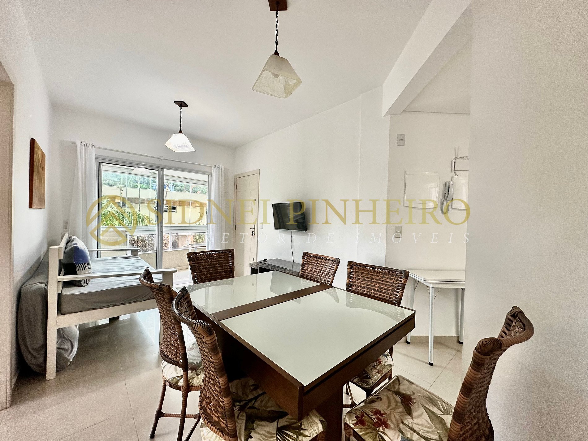 - Sala com sofá, Smart TV e saída para a sacada;
