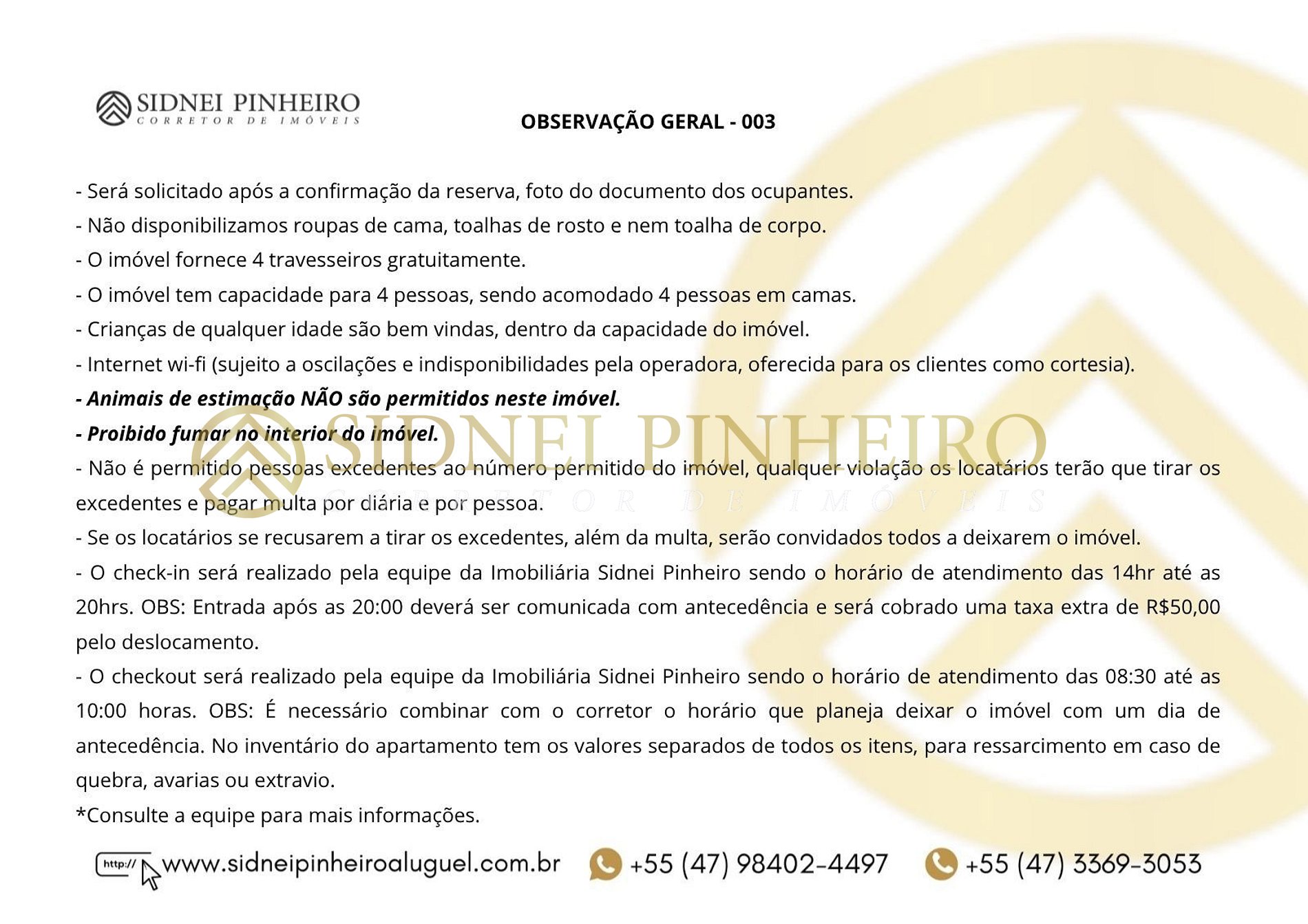 - O check-in será realizado pela equipe da Imobiliária Sidnei Pinheiro sendo o horário de atendimento das 14hr até as 20hrs. OBS: Entrada após as 20:00 deverá ser comunicada com antecedência e será cobrado uma taxa extra de R$50,00 pelo deslocamento.