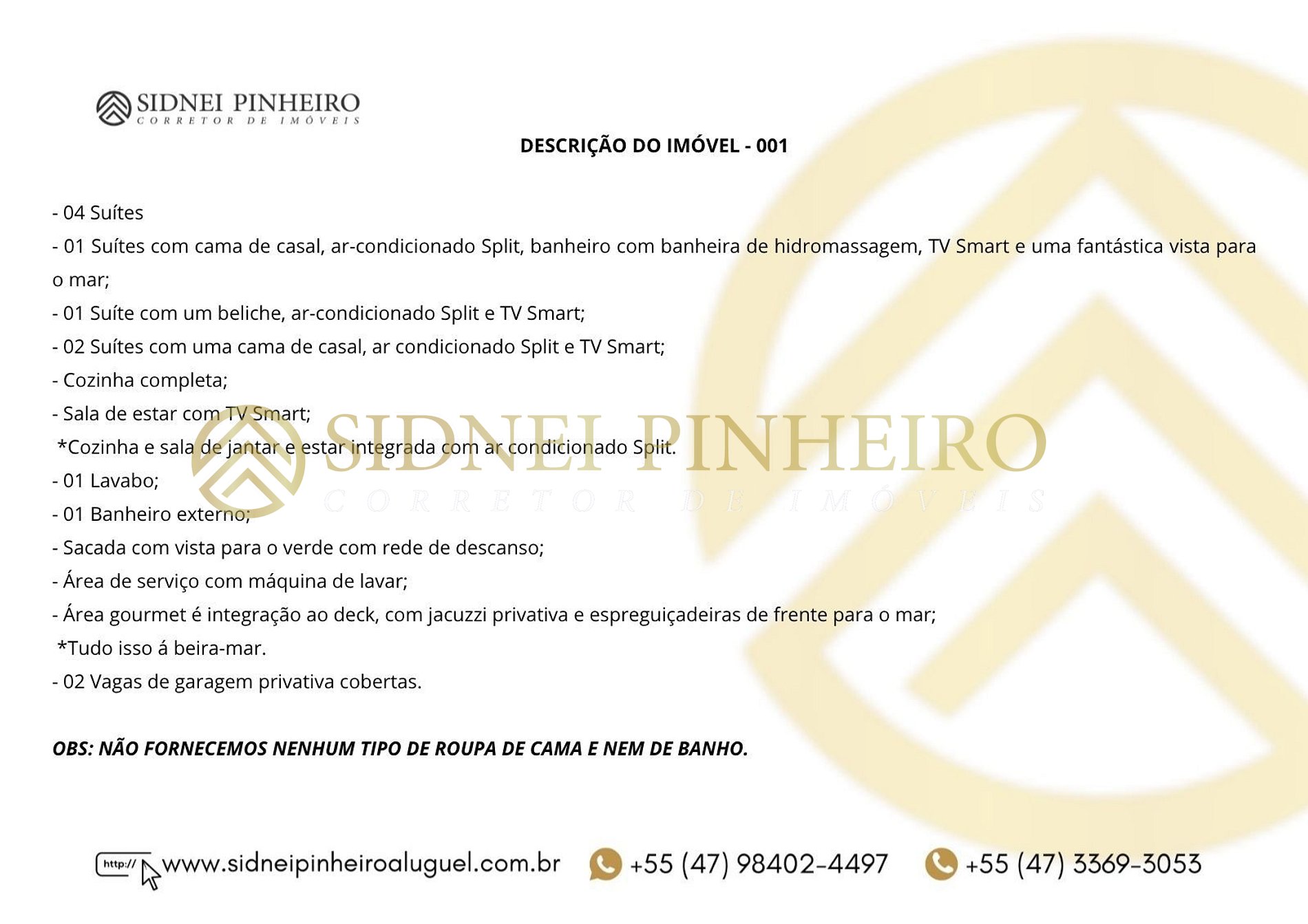 OBS: NÃO FORNECEMOS NENHUM TIPO DE ROUPA DE CAMA E NEM DE BANHO.