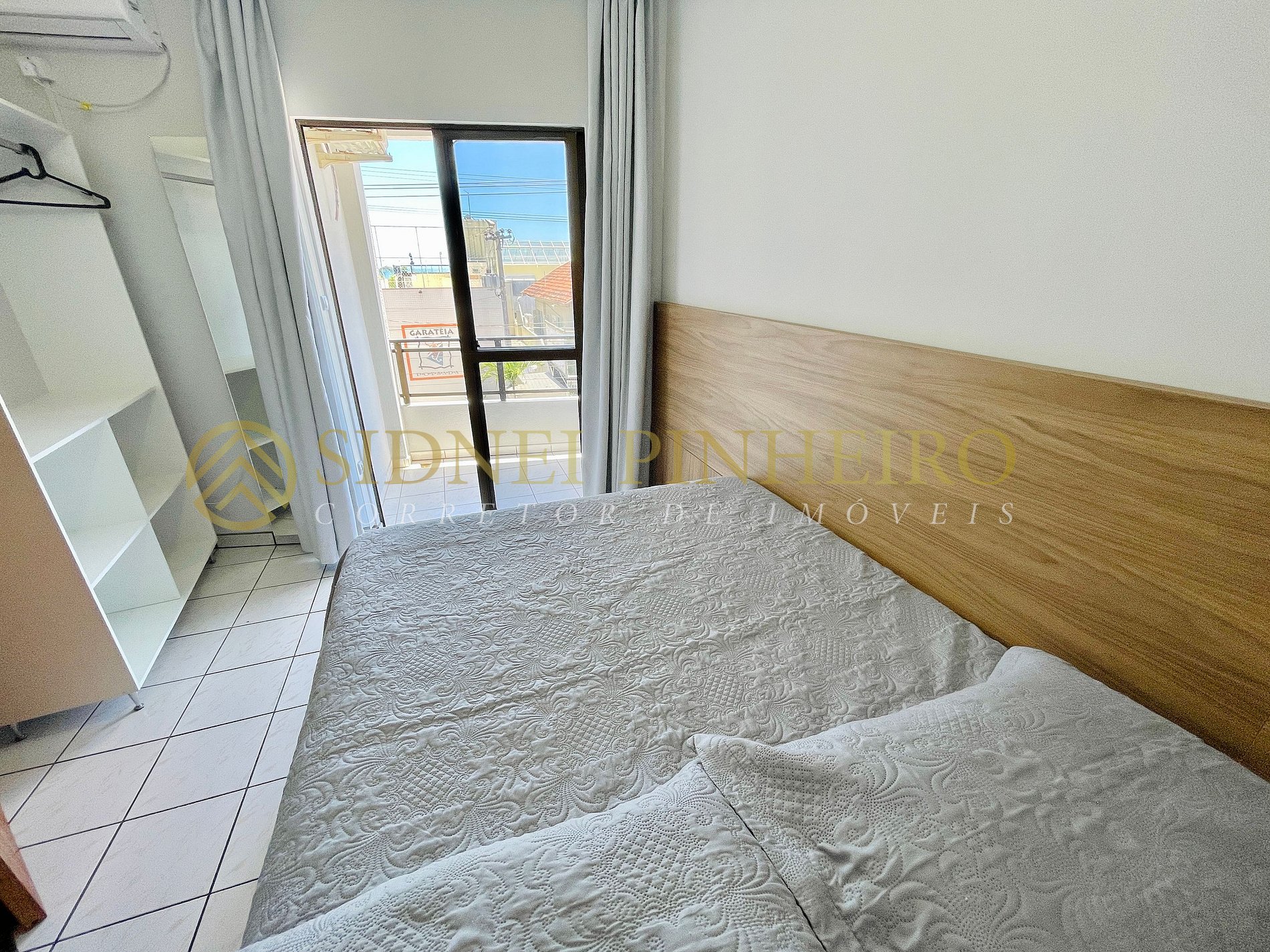 - 1 dormitório com cama de casal e ar condicionado e também, uma sacada com vista para a avenida principal;