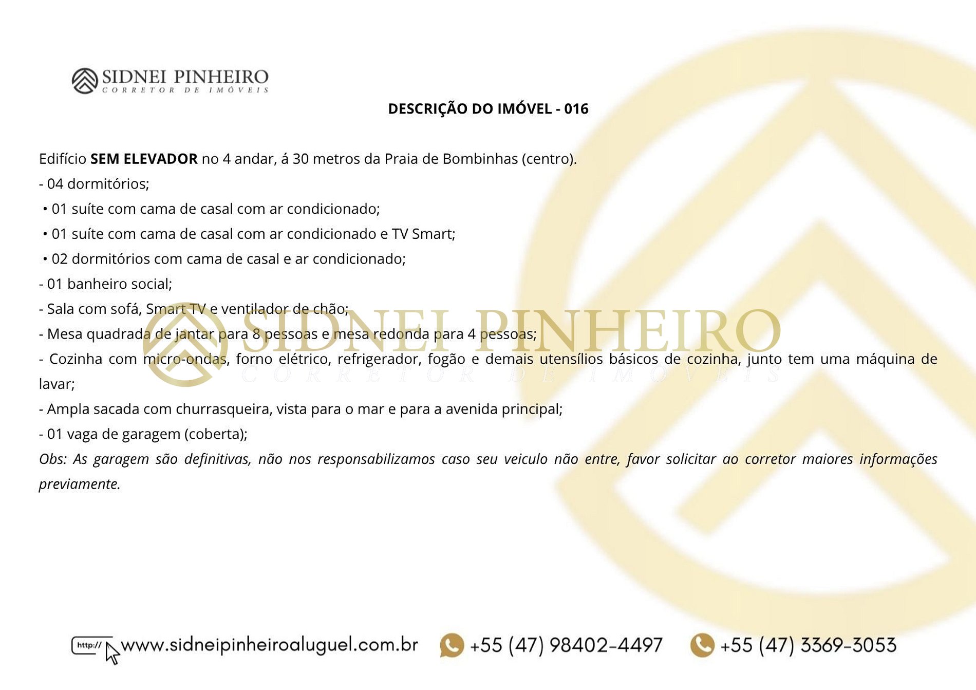 Edifício SEM ELEVADOR no 4 andar, á 30 metros da Praia de Bombinhas (centro).