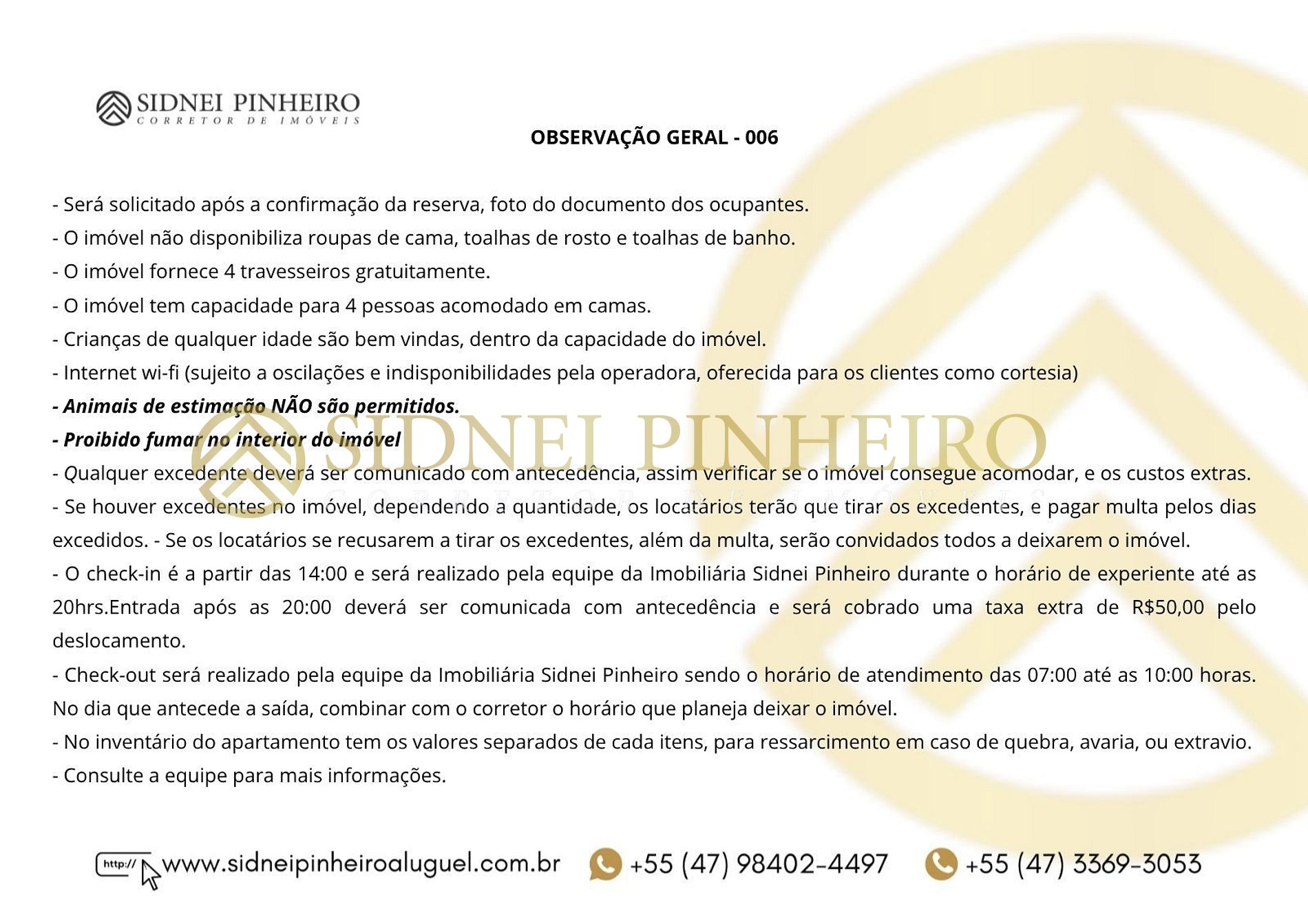 - Check-in será realizado pela equipe da Imobiliária Sidnei Pinheiro sendo o horário de atendimento das 14hr até as 20hrs. Entrada após as 20:00 deverá ser comunicada com antecedência e será cobrado uma taxa extra de R$:50,00 pelo deslocamento.