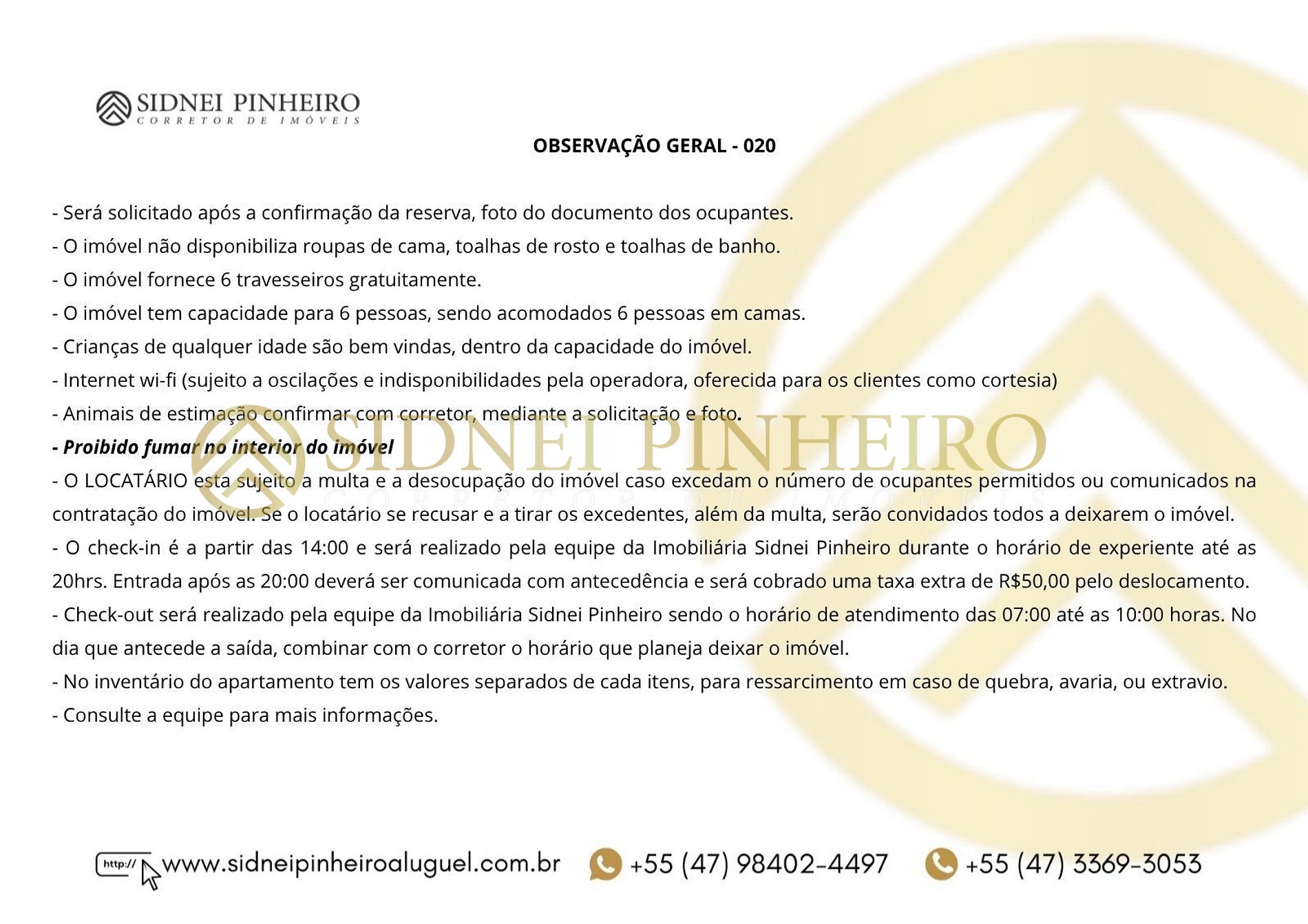- Check-in será realizado pela equipe da Imobiliária Sidnei Pinheiro sendo o horário de atendimento das 14hr até as 20hrs. Entrada após as 20:00 deverá ser comunicada com antecedência e será cobrado uma taxa extra de R$:50,00 pelo deslocamento.