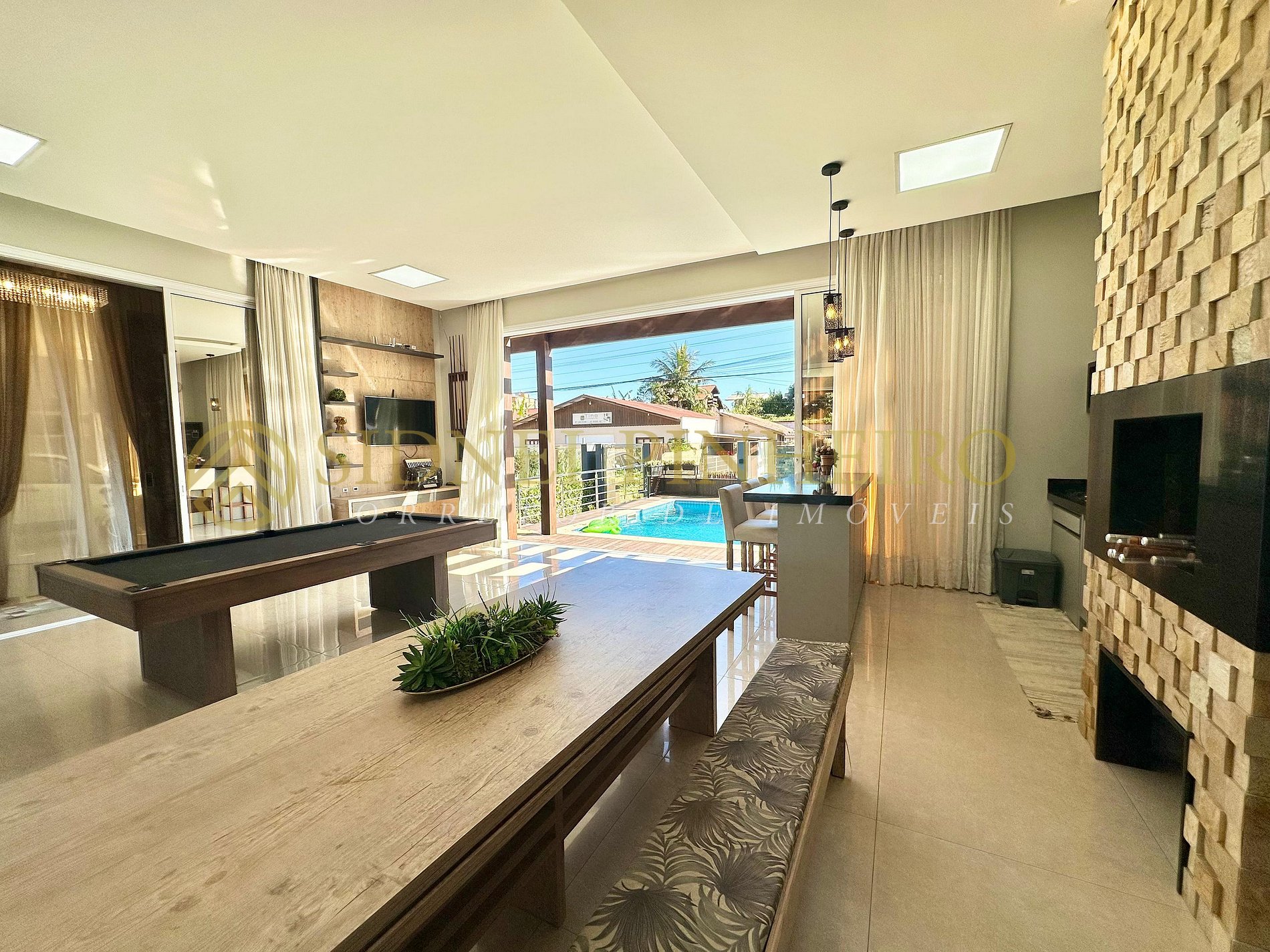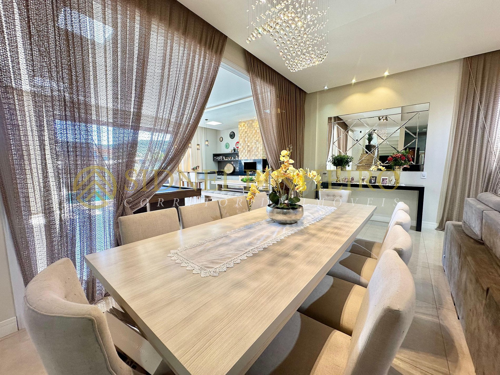- Sala com Smart TV integrada com a sala de jantar com mesa para 10 pessoas;