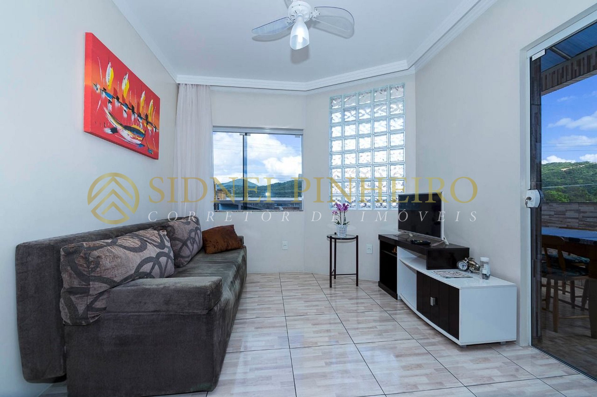 > Sala com sofá, TV;
