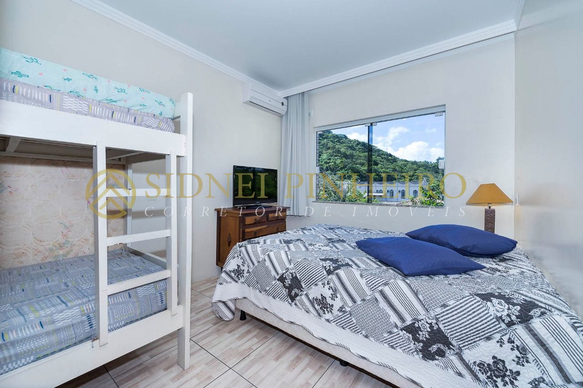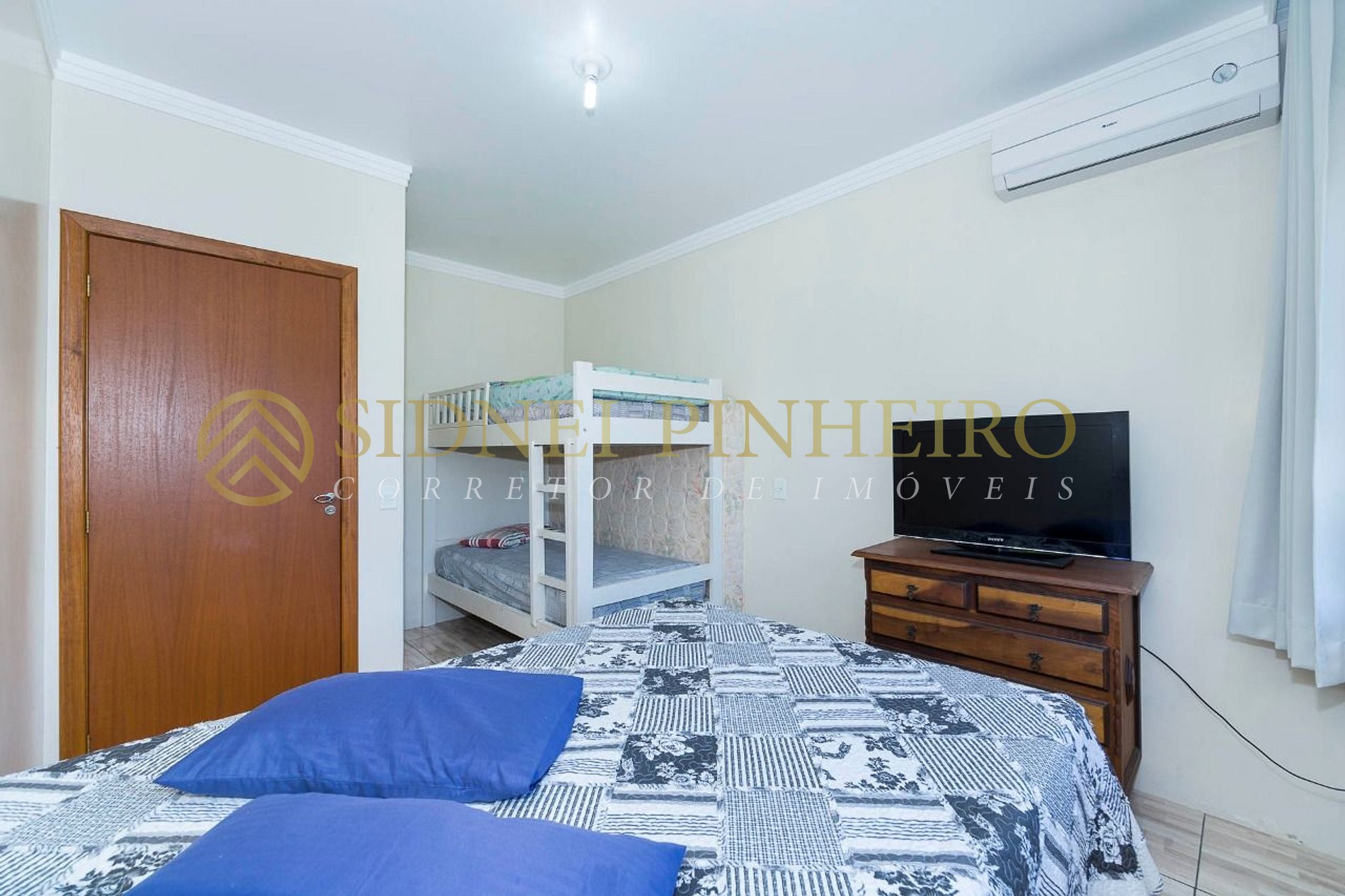 - 1 dormitório com cama de casal e uma beliche, e ar condicionado split