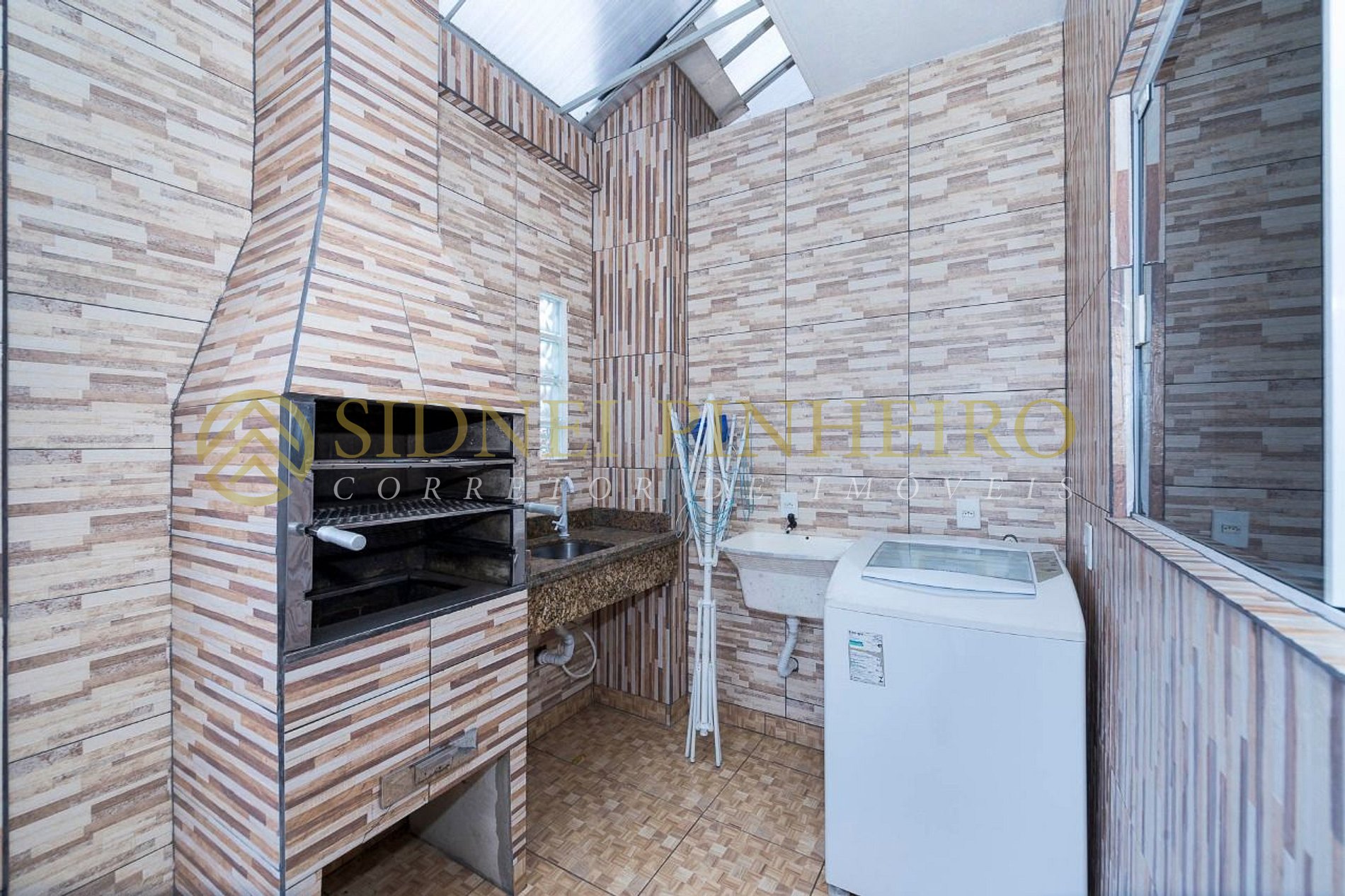 > Área de serviço com máquina de lavar roupas e tanque de mão;