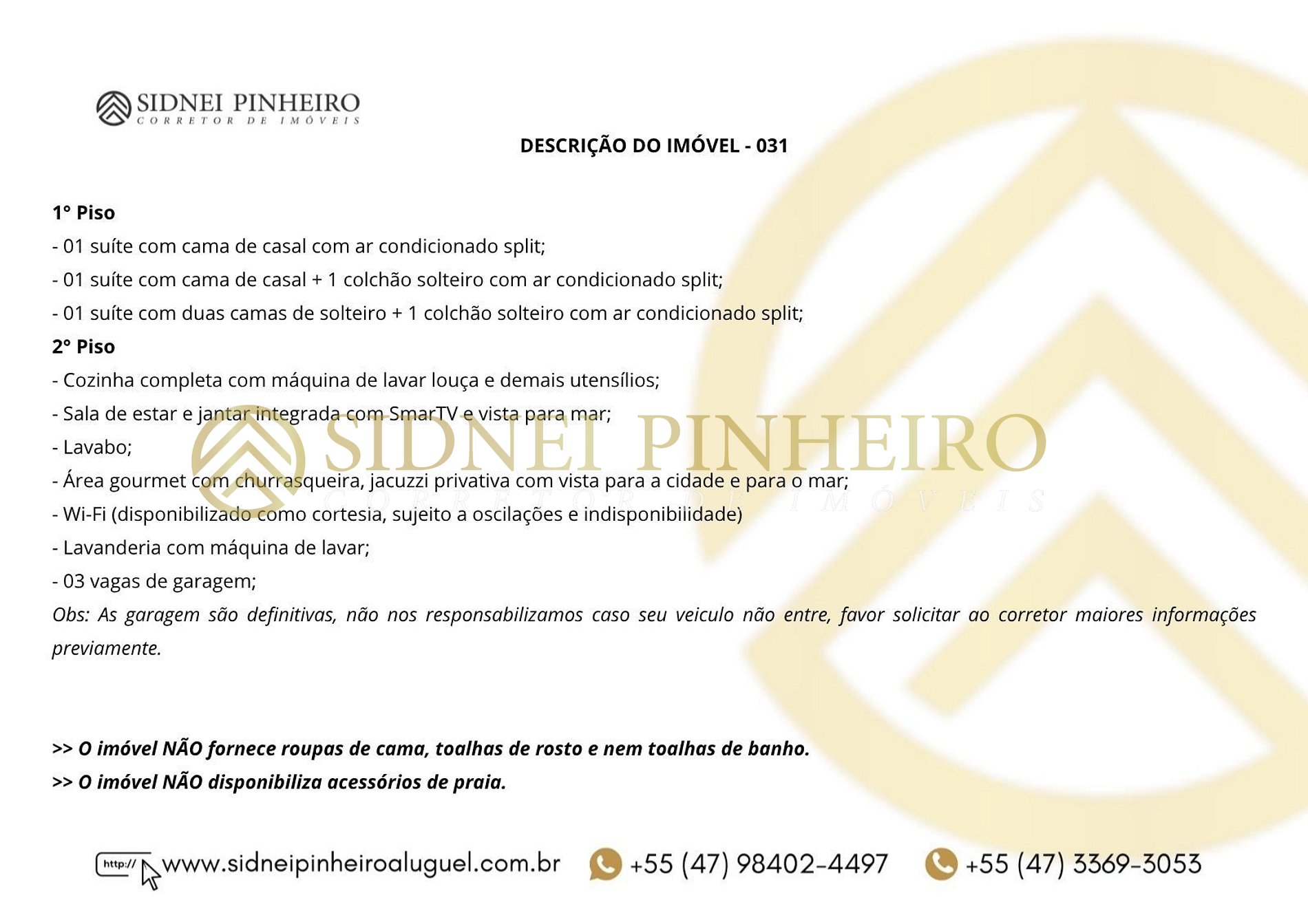 - Checkout será realizado pela equipe da Imobiliária Sidnei Pinheiro sendo o horário de atendimento das 07:00 até as 10:00 horas. No dia que antecede a saída, combinar com o corretor o horário que planeja deixar o imóvel.