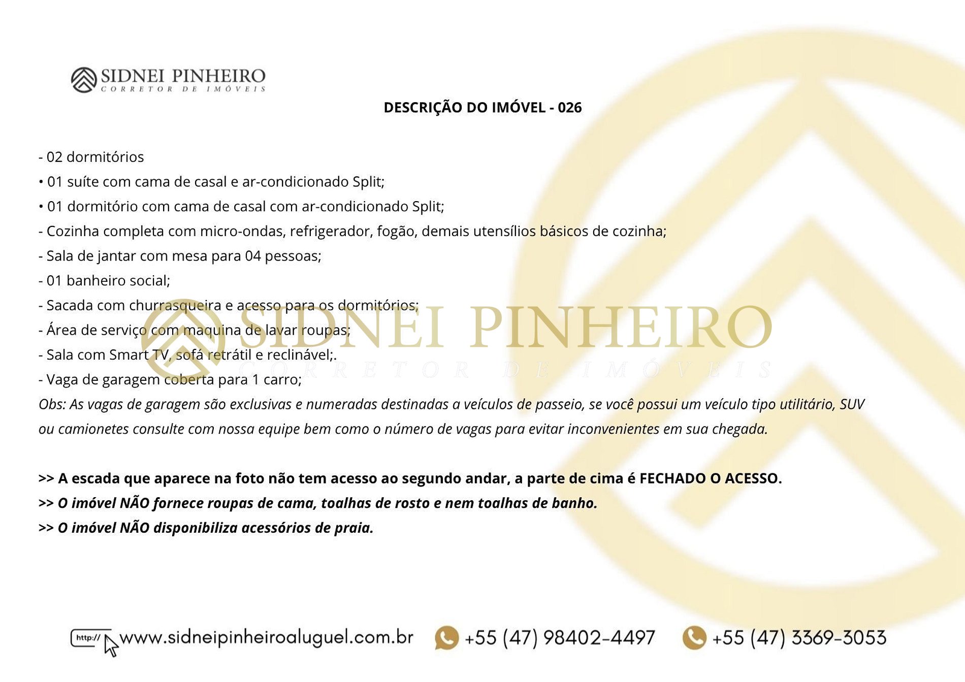 - Check-out será realizado pela equipe da Imobiliária Sidnei Pinheiro sendo o horário de atendimento das 07:00 até as 10:00 horas. No dia que antecede a saída, combinar com o corretor o horário que planeja deixar o imóvel. No inventário do apartamento tem os valores separados de cada item, para ressarcimento em caso de quebra, avaria ou extravio. Consulte a equipe para mais informações.