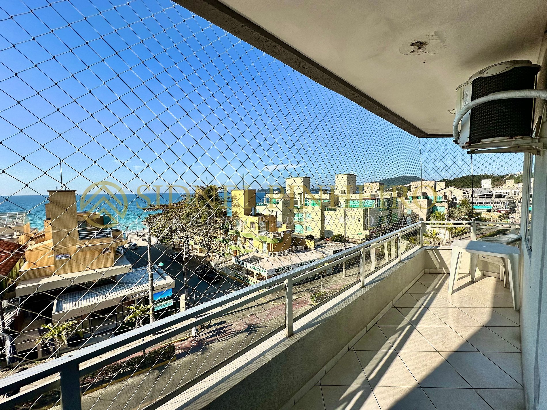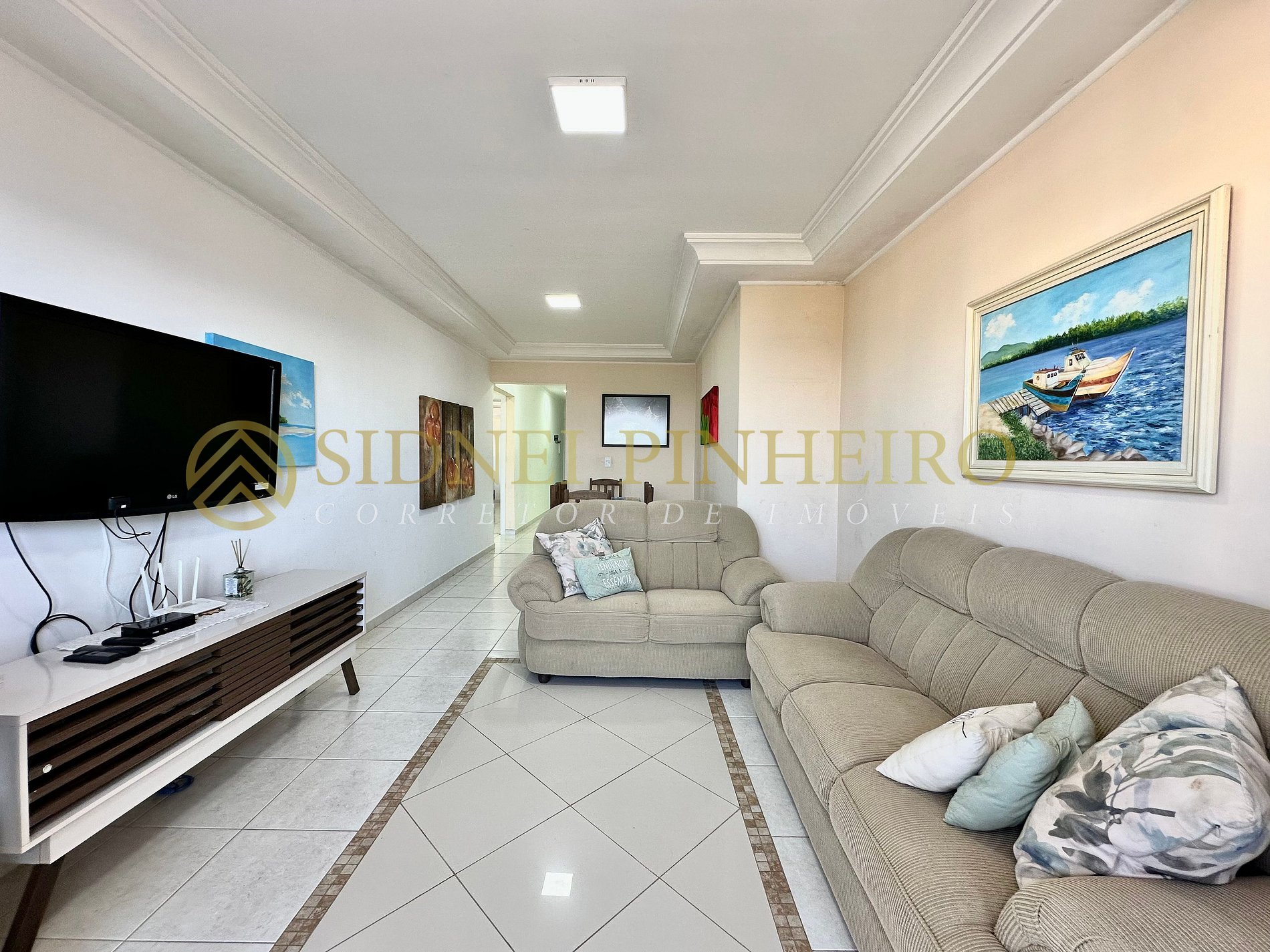 - Sala com sofá, TV e acesso para a sacada com vista mar;