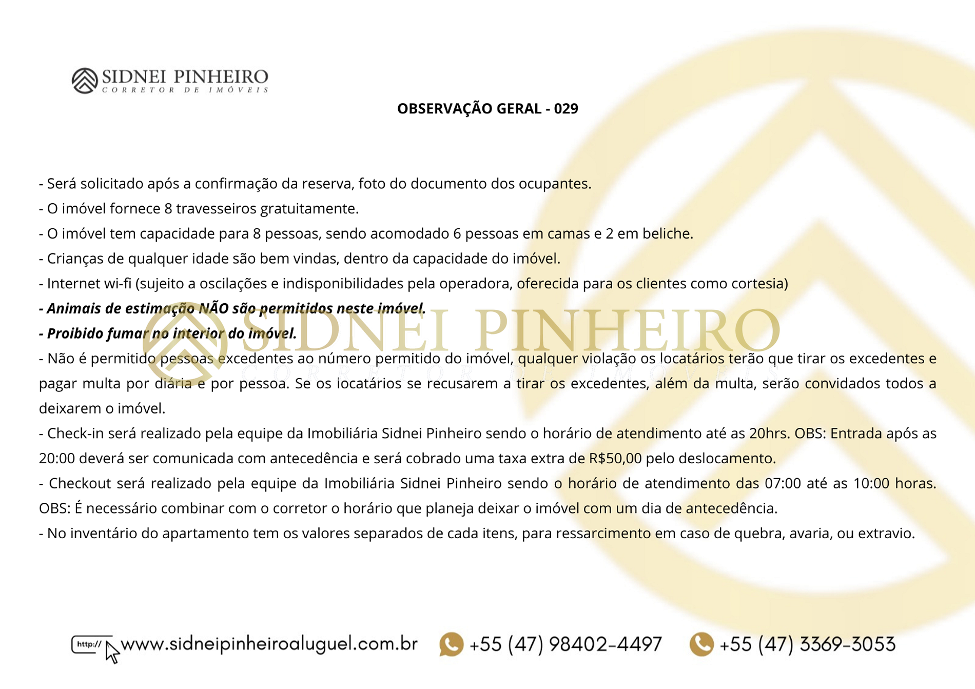 - Check-out será realizado pela equipe da Imobiliária Sidnei Pinheiro sendo o horário de atendimento das 08:30 até as 10:00 horas. No dia que antecede a saída, combinar com o corretor o horário que planeja deixar o imóvel. No inventário do apartamento tem os valores separados de cada item, para ressarcimento em caso de quebra, avaria ou extravio. Consulte a equipe para mais informações.