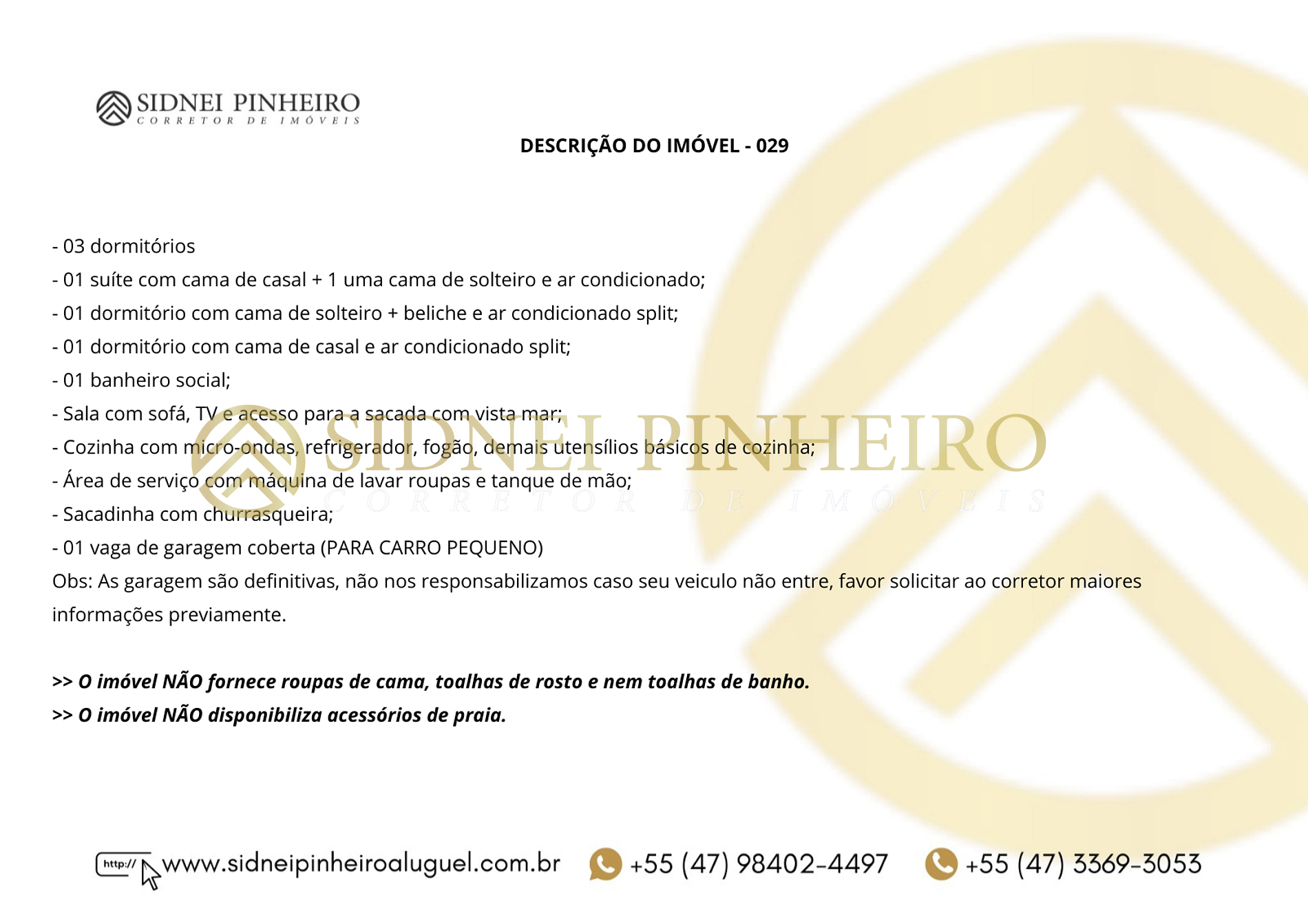 - Check-out será realizado pela equipe da Imobiliária Sidnei Pinheiro sendo o horário de atendimento das 08:30 até as 10:00 horas. No dia que antecede a saída, combinar com o corretor o horário que planeja deixar o imóvel. No inventário do apartamento tem os valores separados de cada item, para ressarcimento em caso de quebra, avaria ou extravio. Consulte a equipe para mais informações.