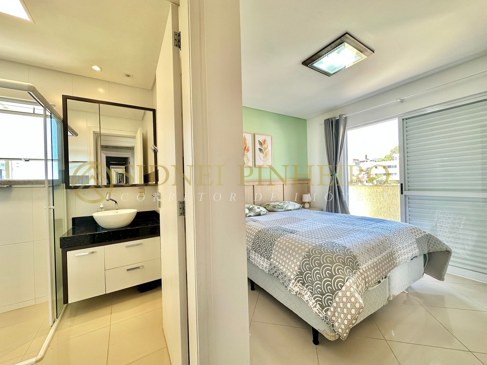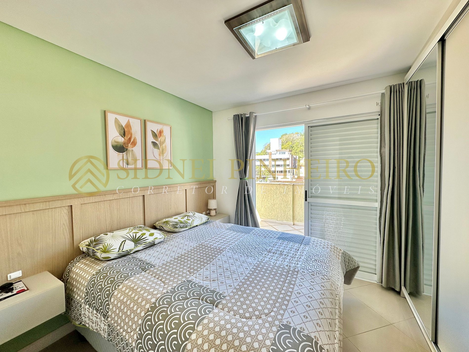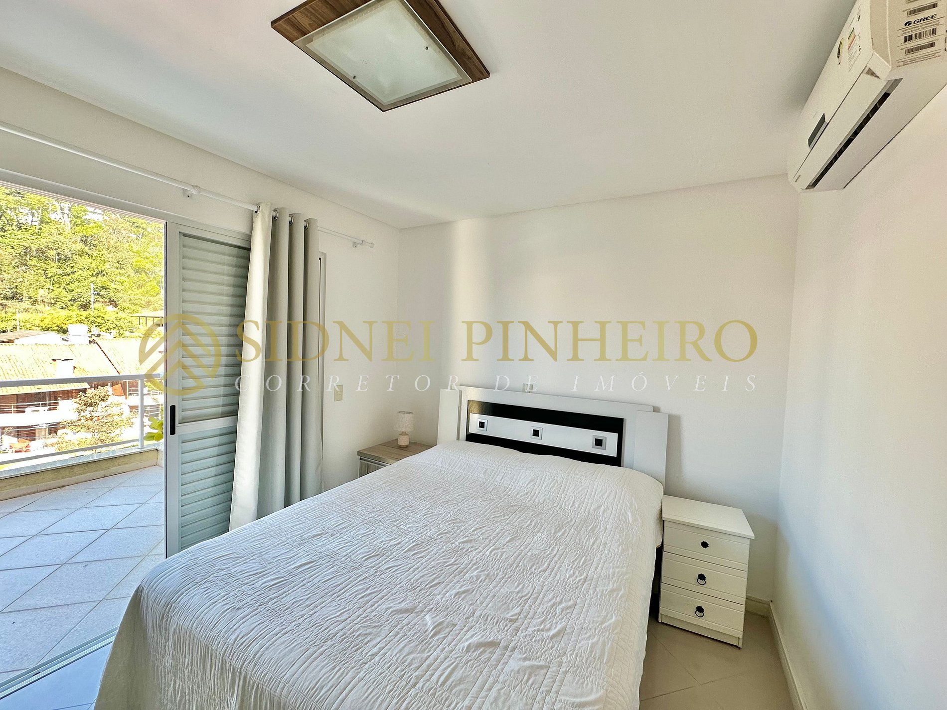 • 1 suíte com cama de casal, ar condicionado Split e saída para a sacada com vista para o mar;