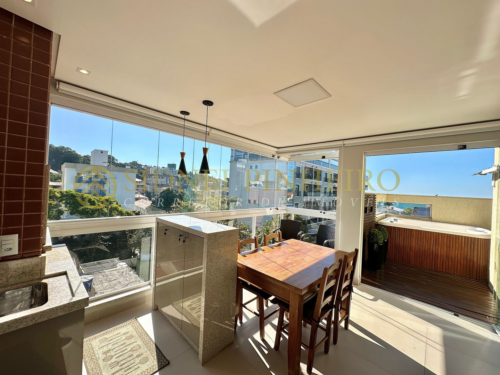 - Área gourmet com churrasqueira, jacuzzi privativa e vista para o mar;