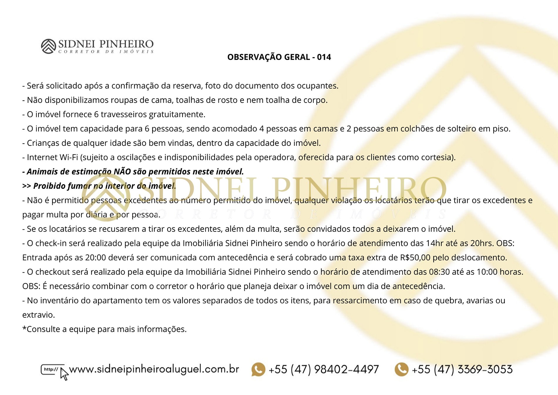 - O checkout será realizado pela equipe da Imobiliária Sidnei Pinheiro sendo o horário de atendimento das 08:30 até as 10:00 horas. OBS: É necessário combinar com o corretor o horário que planeja deixar o imóvel com um dia de antecedência. No inventário do apartamento tem os valores separados de todos os itens, para ressarcimento em caso de quebra, avarias ou extravio.