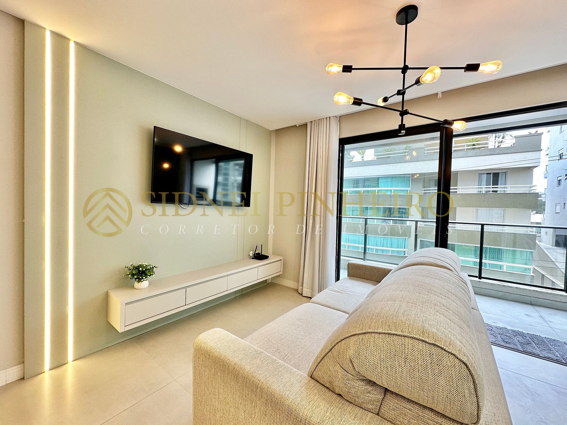 - Sala com sofá, Smart TV e ar condicionado;